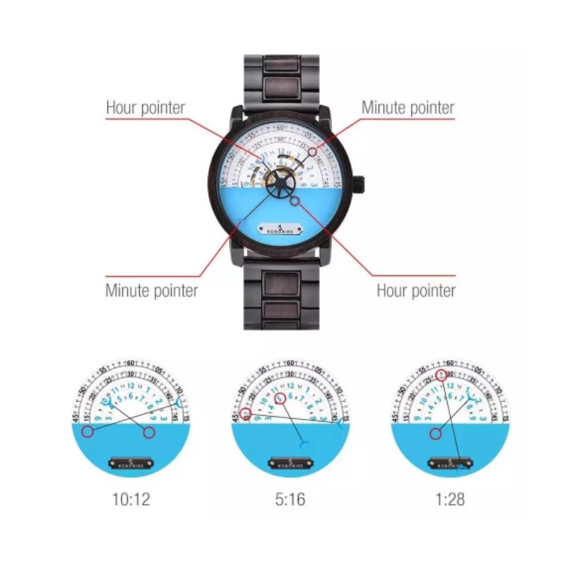 Ke zjištění času se využívají obě dvě ručičky v horní polovině pouzdra hodinek. Větší ručička jsou minuty a menší ručička jsou hodiny. Na jaké místo ukazují, takový čas právě je.