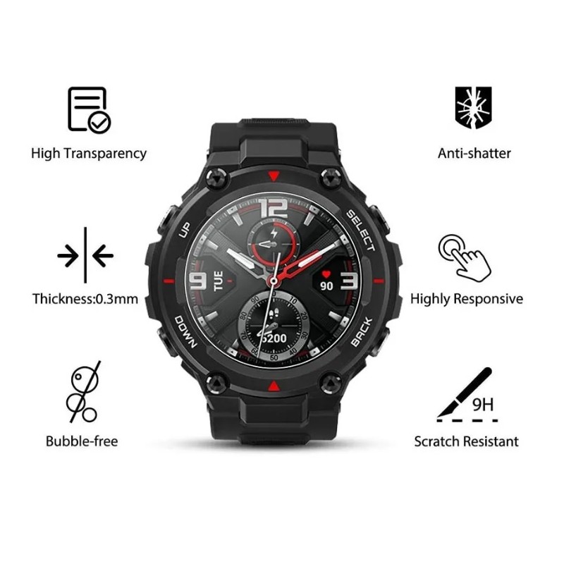 Temperované sklo pro chytré hodinky Amazfit T-Rex se v případě prudkého nárazu rozbije, vždy ovšem zůstane vcelku. Při prudkém nárazu dokáže pohltit velkou část energie, která se uvolní prasknutím, tím zabrání poškození samotného displeje hodinek.